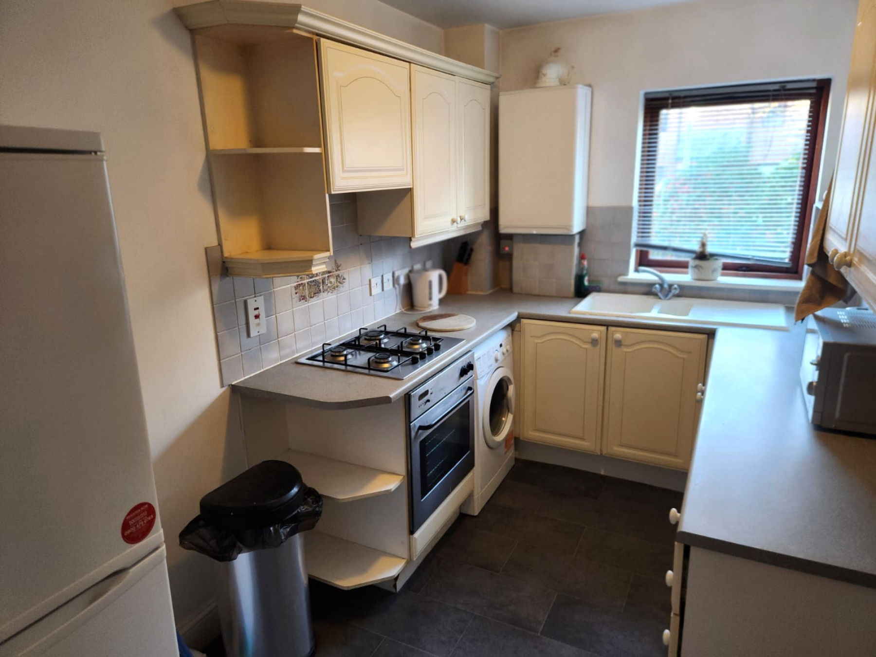 The living room is a comfortable, bright space with plenty of room to relax, and the separate kitchen comes with white goods included, making moving in that little bit easier.