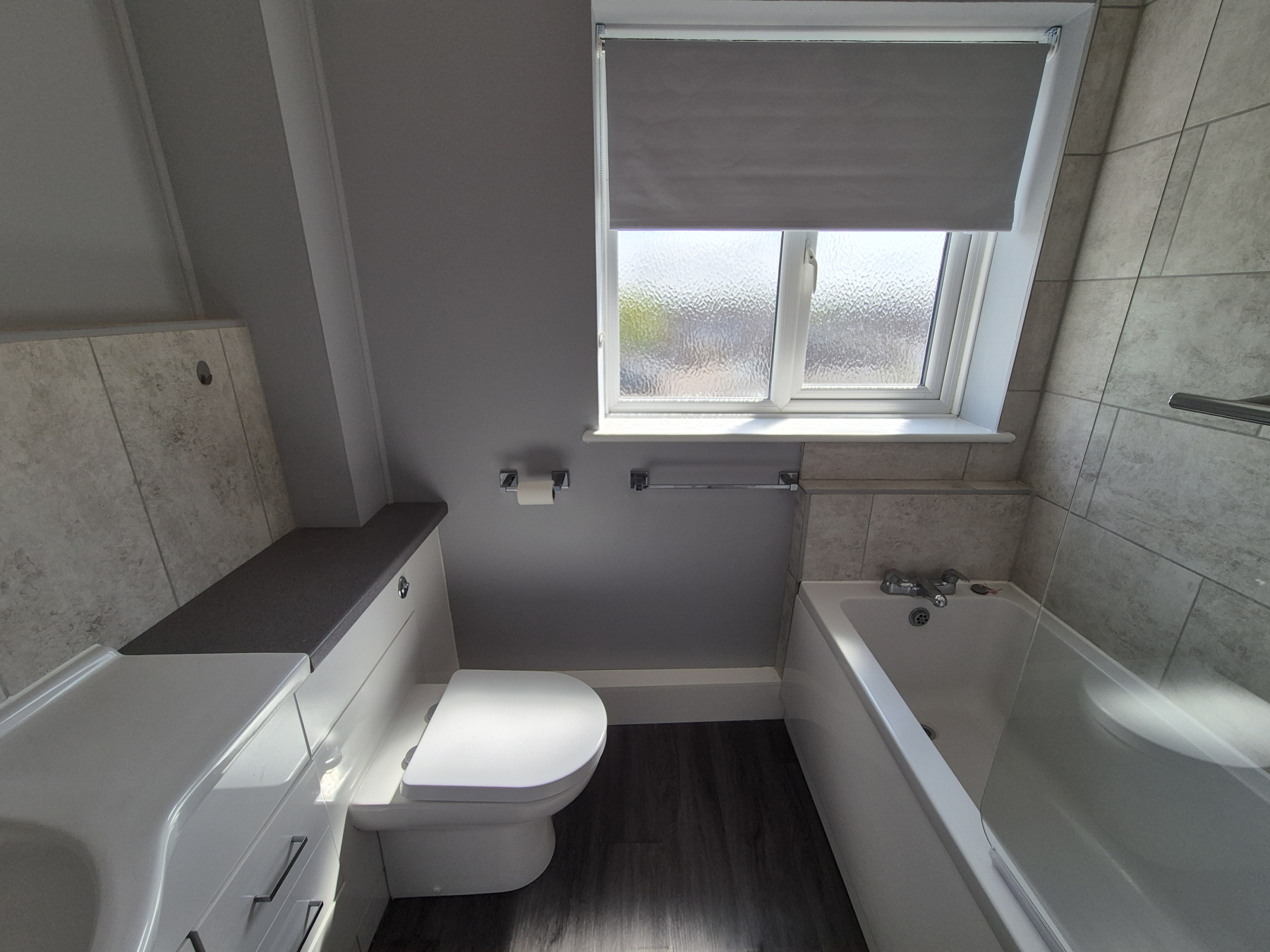 White suite comprising, low level w.c., vanitory unit wash hand basin with under unit storage and drawers, panelled bath with mixer taps to bath and separate shower over with glass shower screen. Opaque window. Slate grey wood effect vinyl flooring. Towel rail, hand towel holder and toilet roll holder.