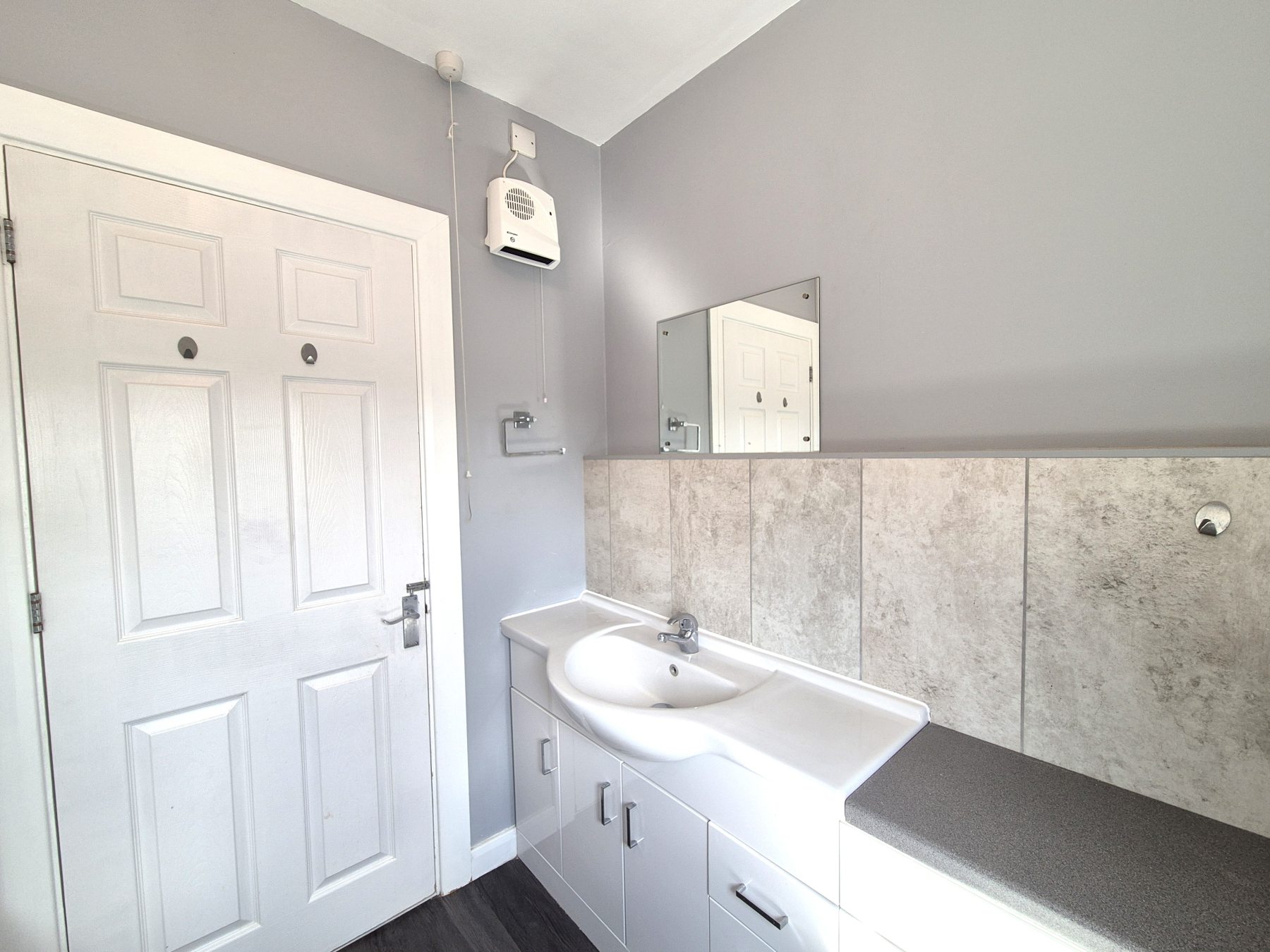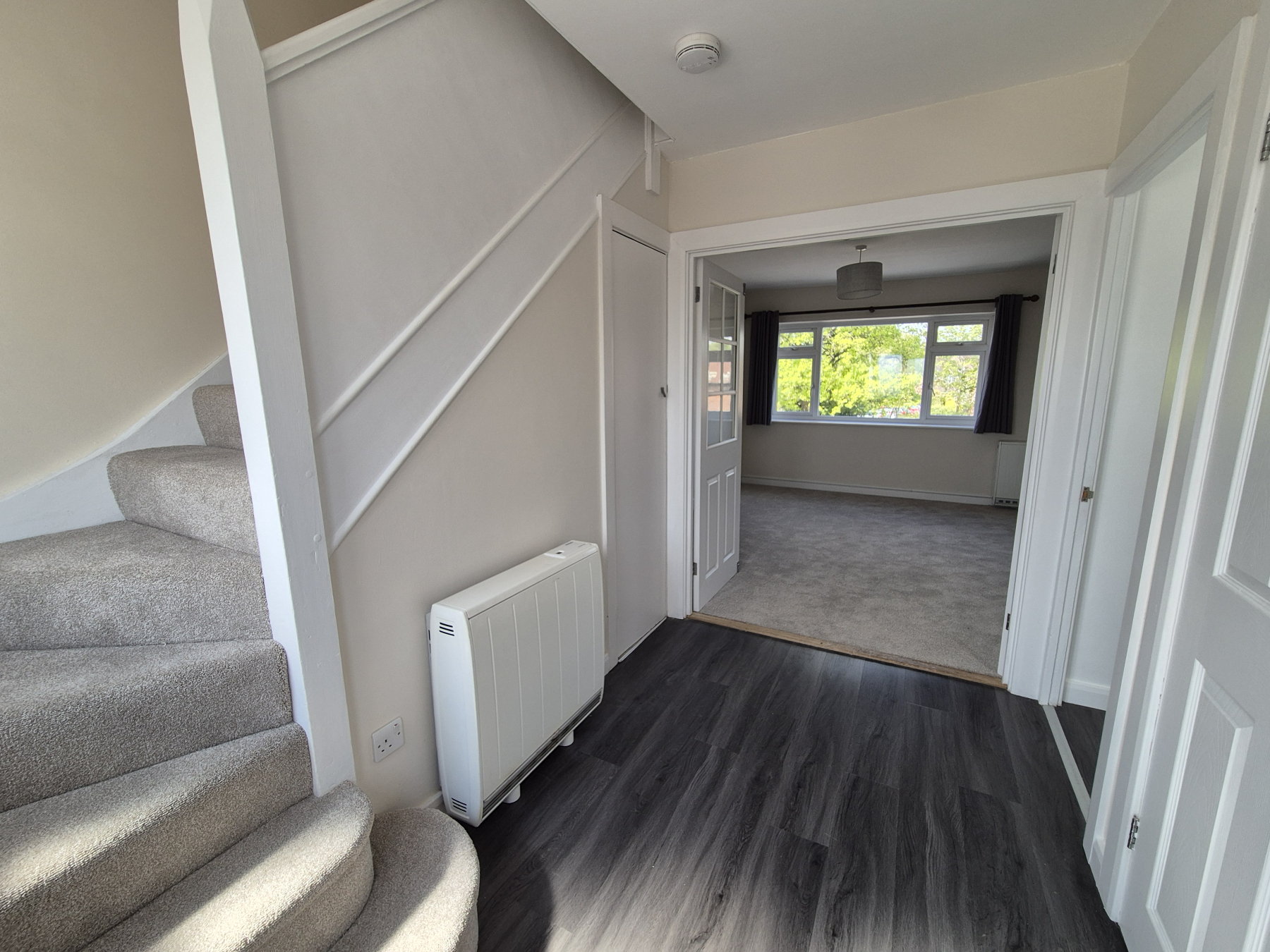 Glazed door and side window to front. Slate grey wood effect vinyl flooring. Heater. Large under stairs cupboard and further storage cupboard.