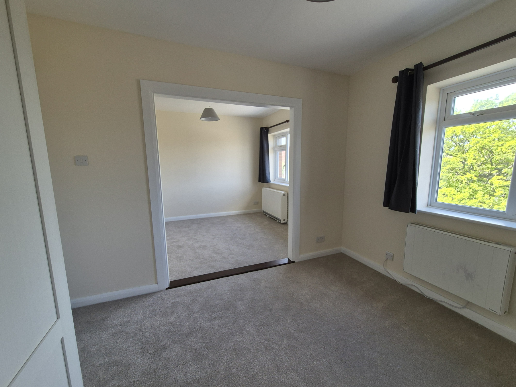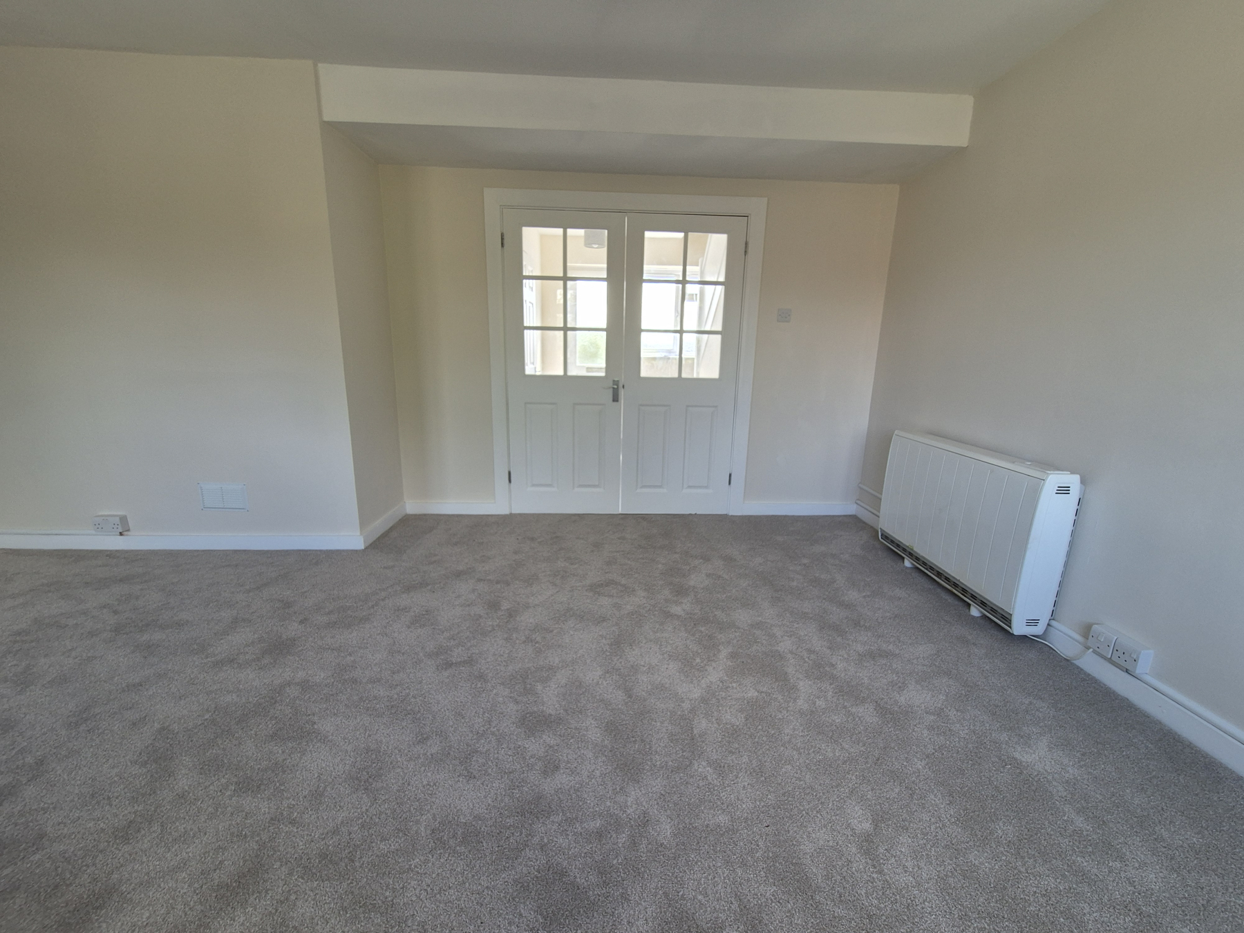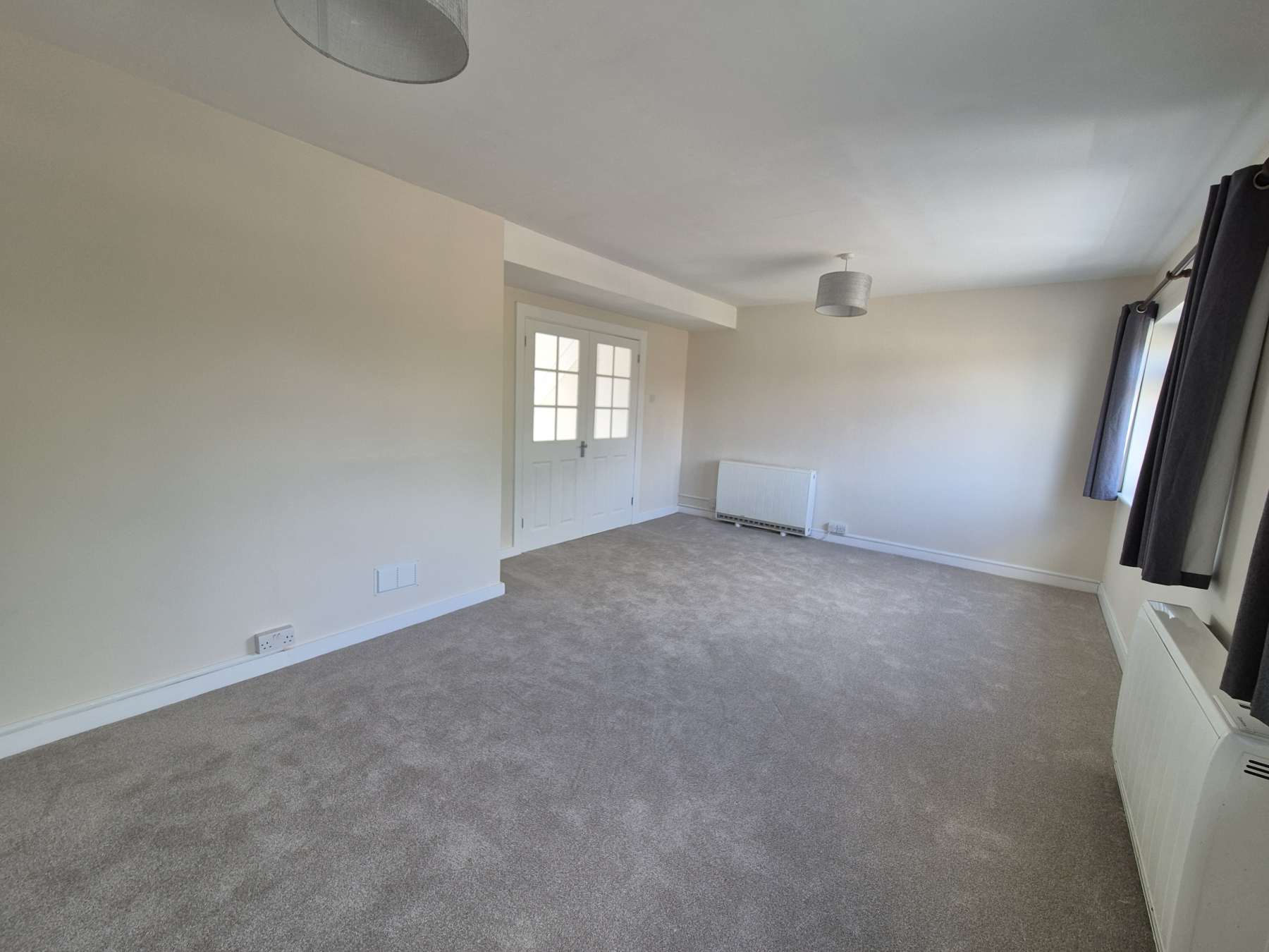 Glass panelled double doors leading into this large sunny room with two windows with new curtains affixed. New light shades. Newly carpeted in beige. Two heaters.
