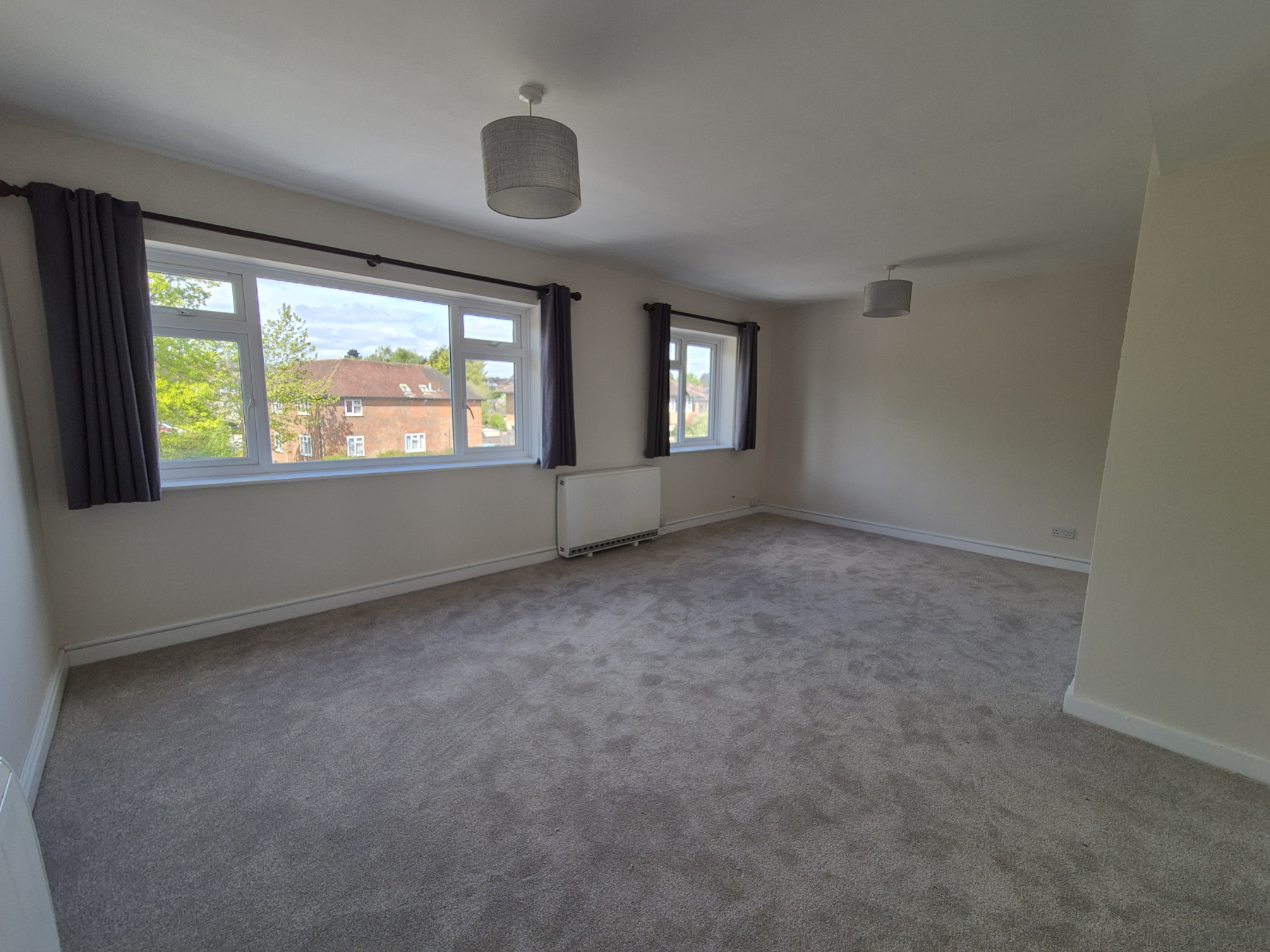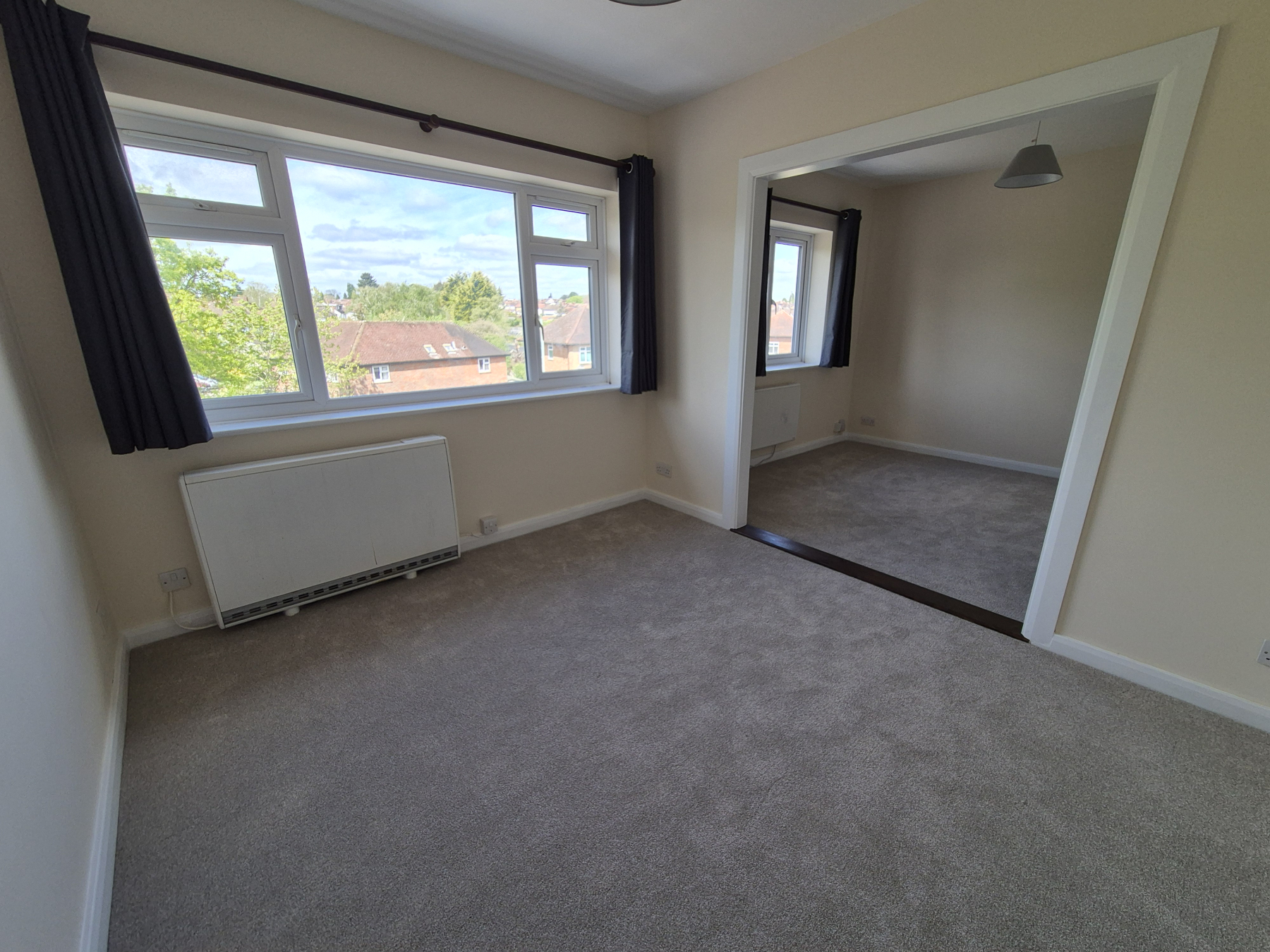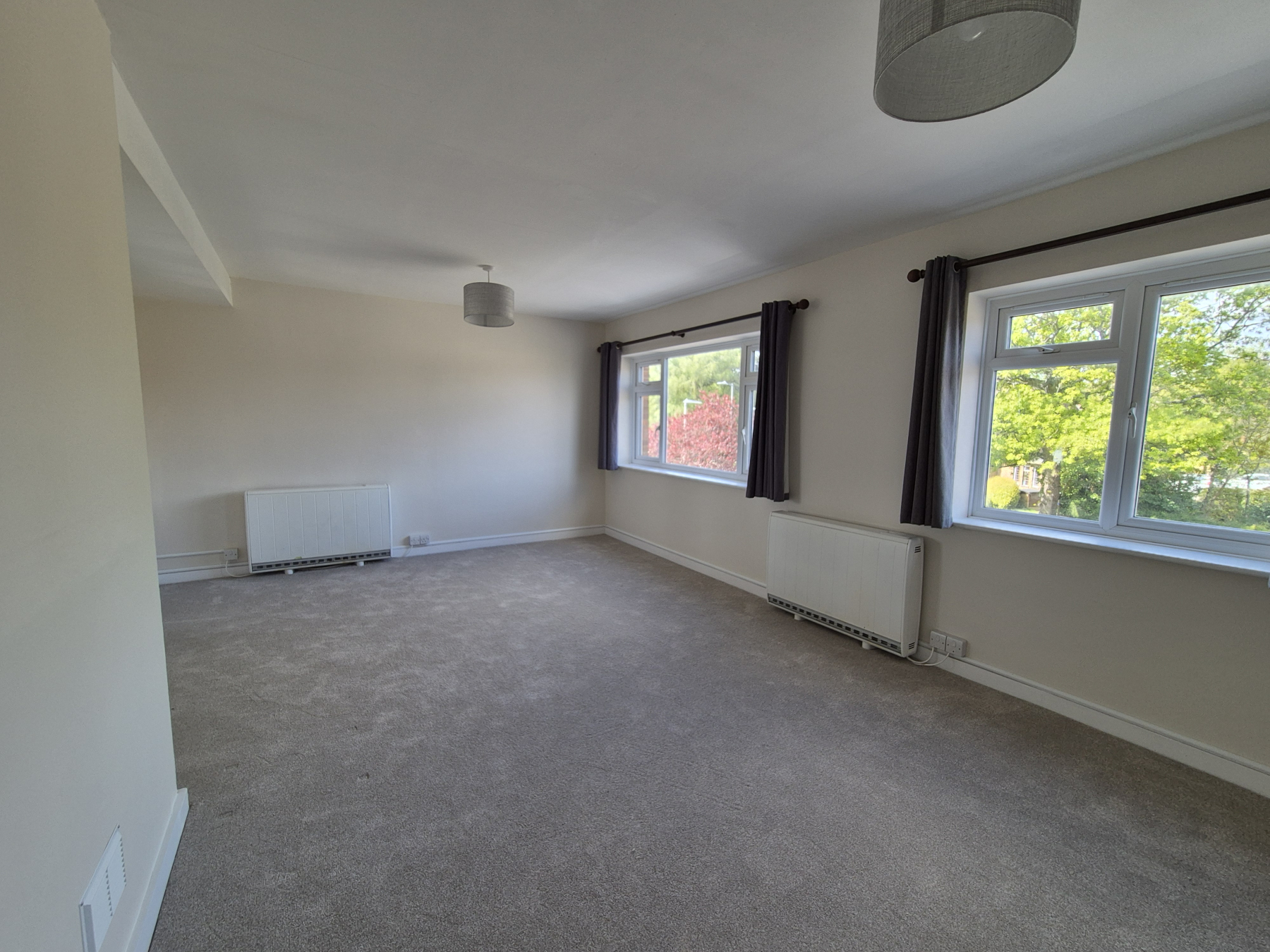 Glass panelled double doors leading into this large sunny room with two windows with new curtains affixed. New light shades. Newly carpeted in beige. Two heaters.