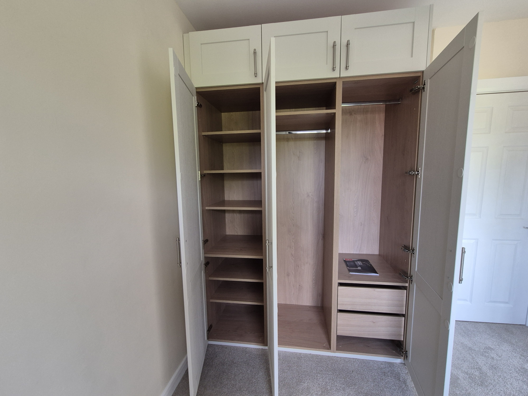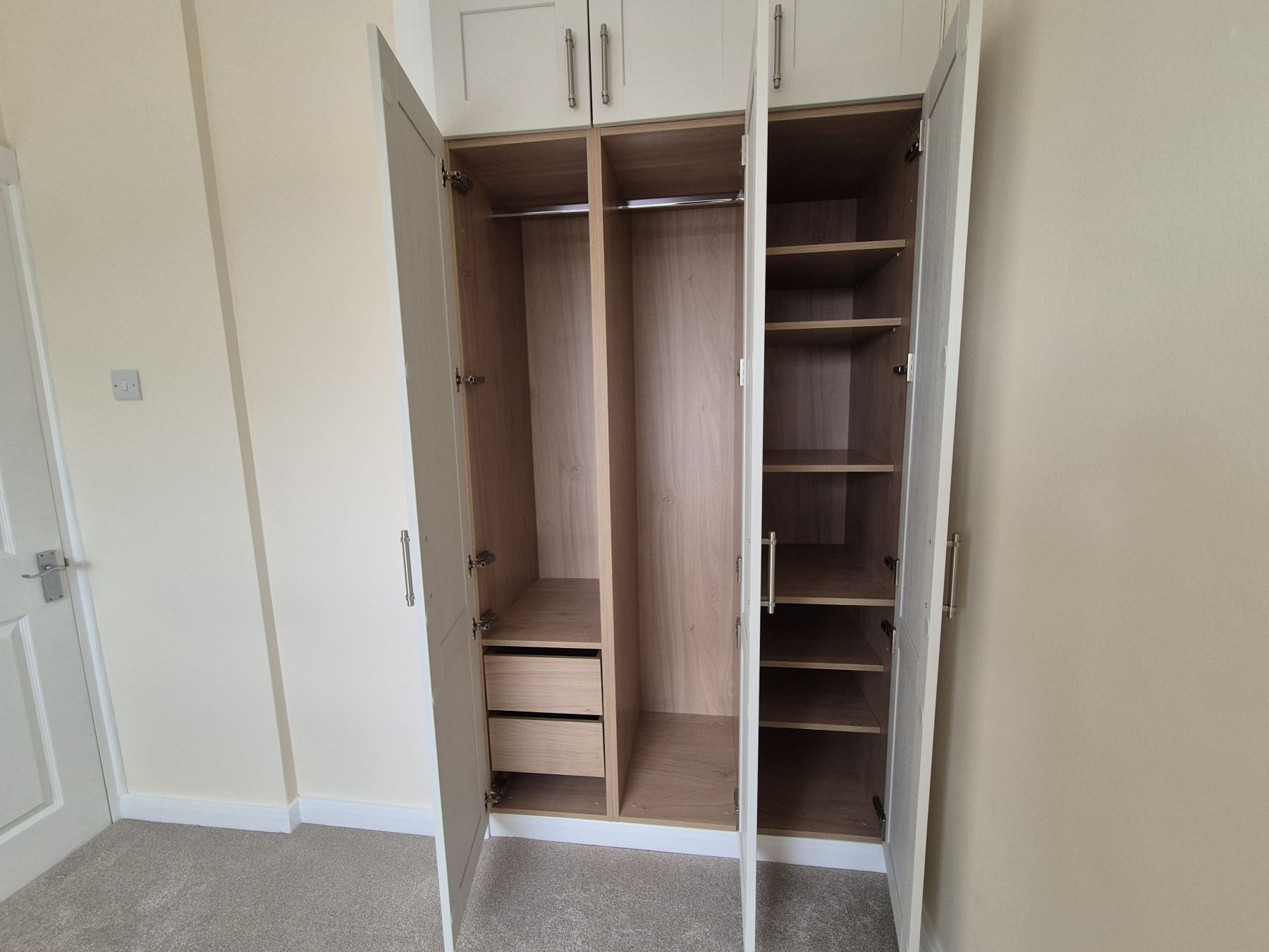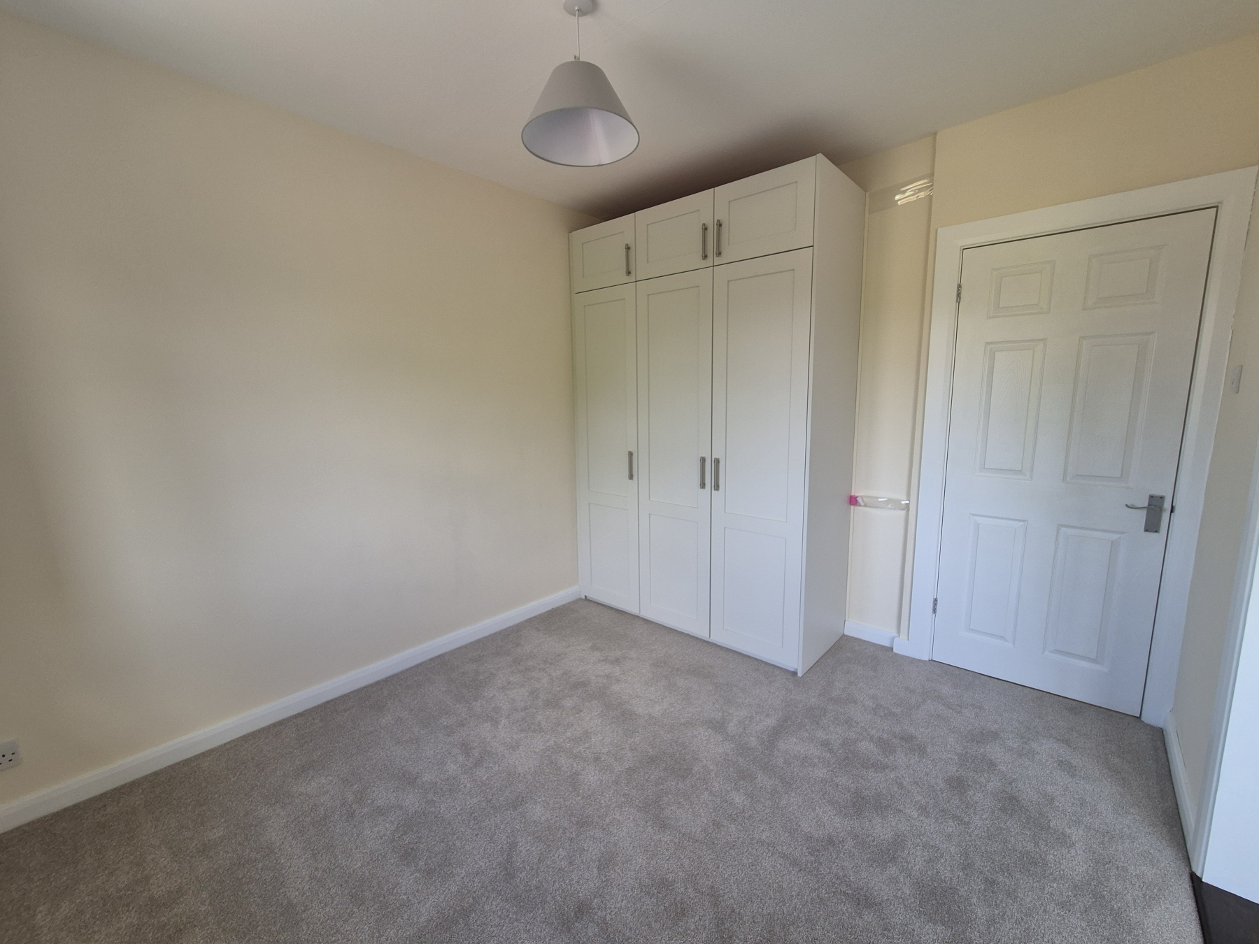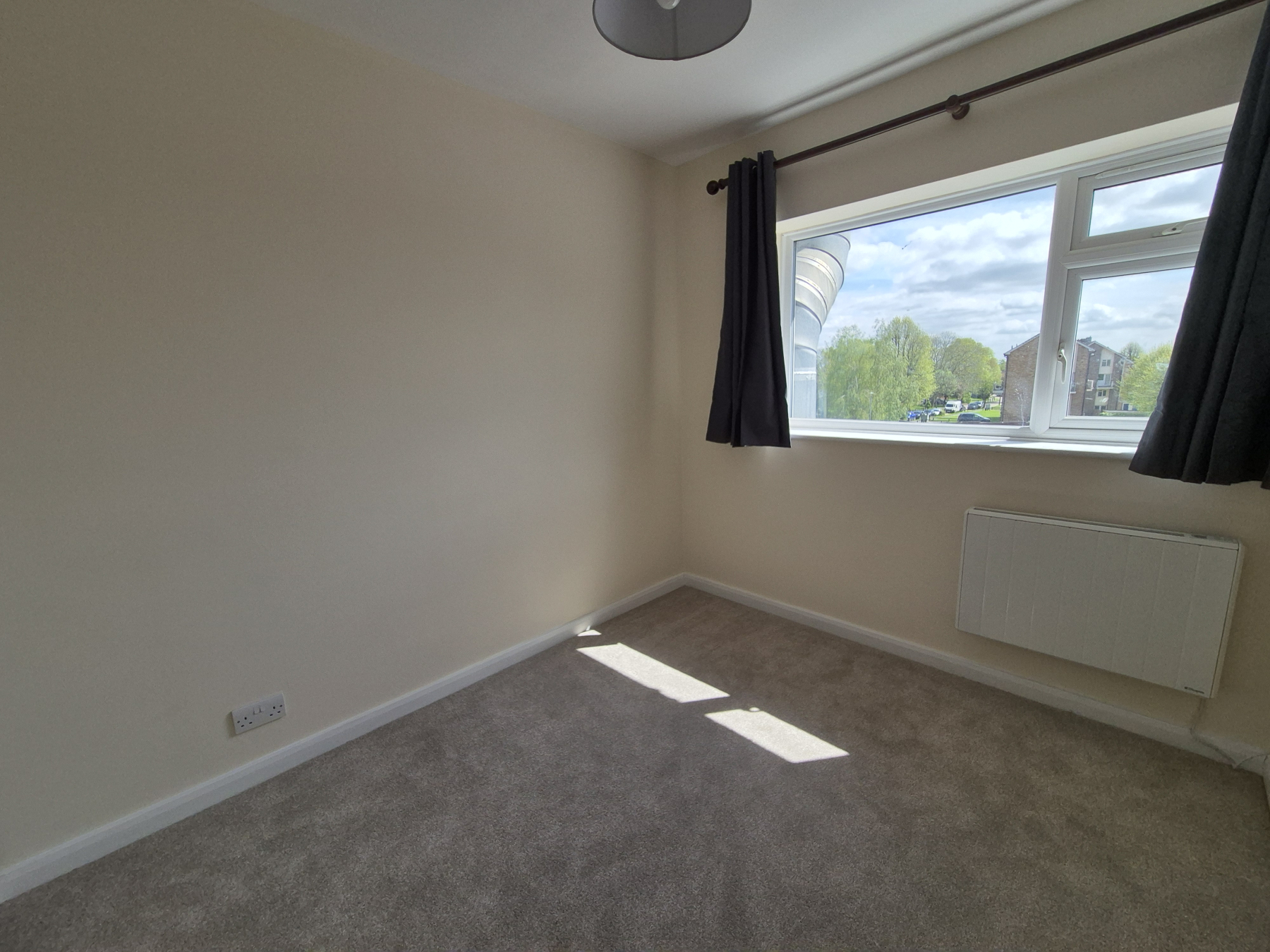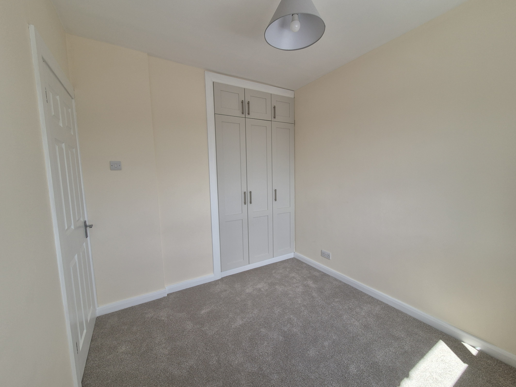 One window with new curtains affixed. New light shade. New beige carpet. Range of good quality built-in wardrobes with hanging rails, shelves and drawers. Heater.