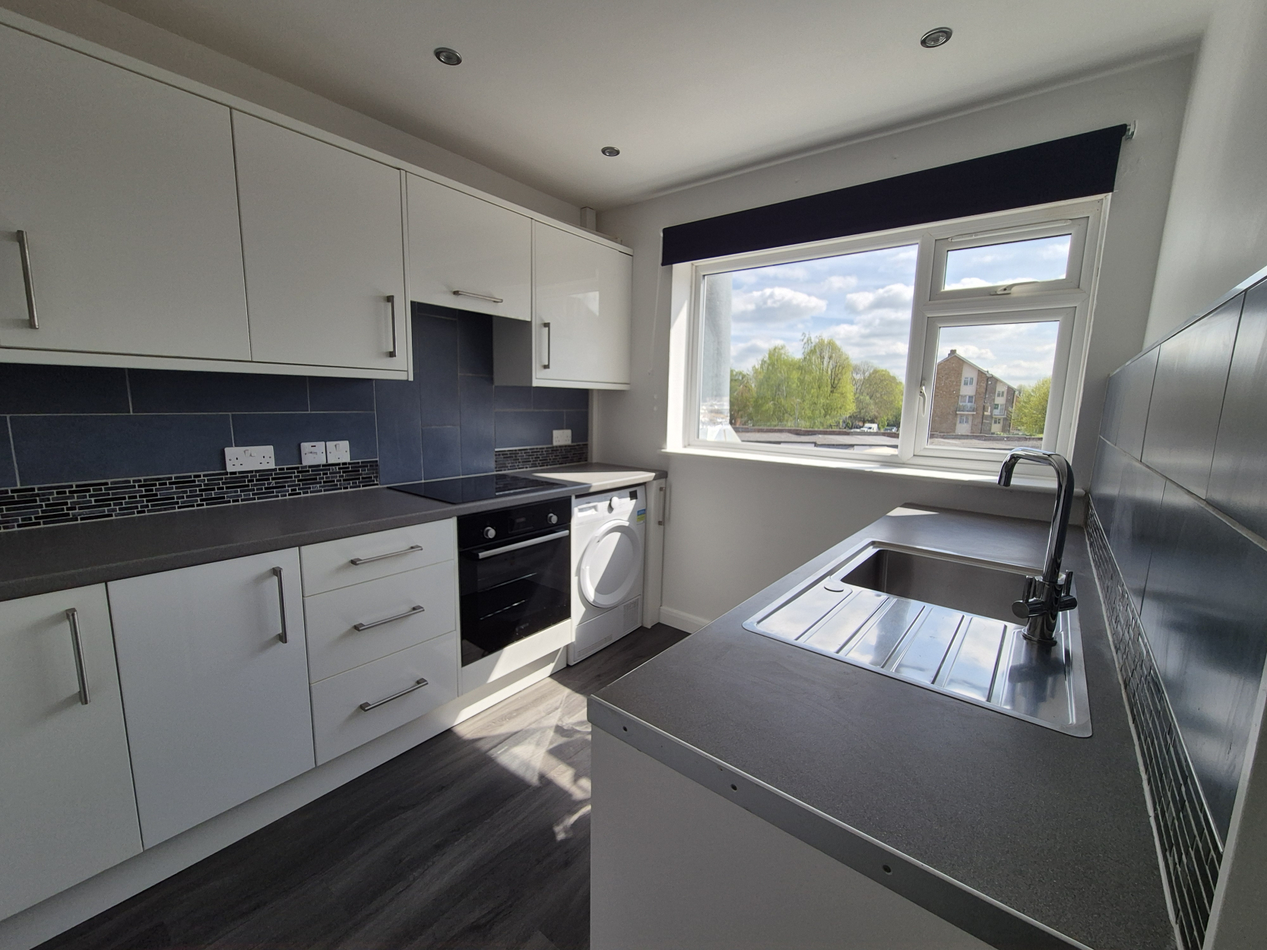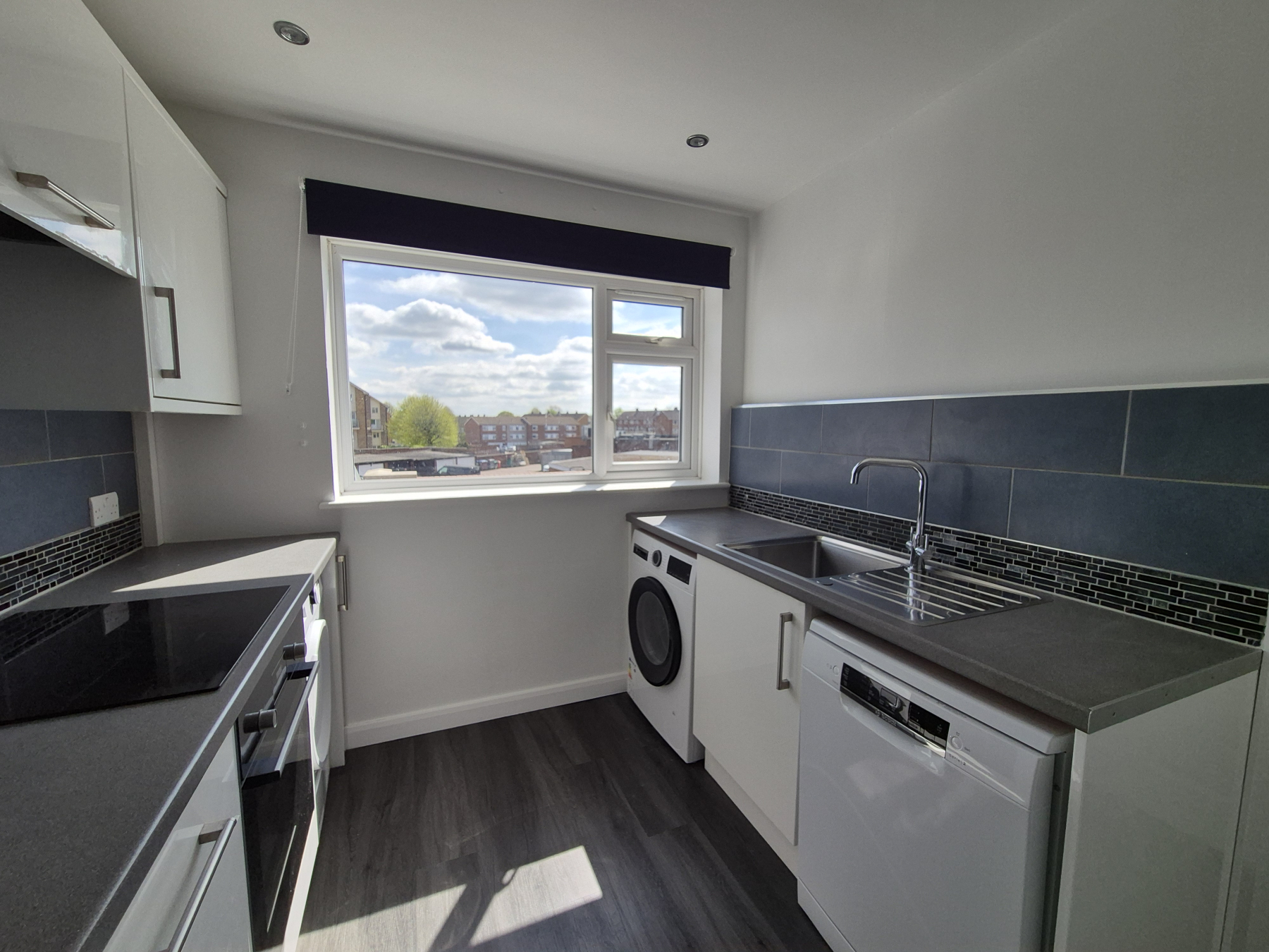 Comprising white wall and base units with complimentary grey worktops. White walls with grey splashbacks. Recess spotlights. Window to front with blind. Stainless steel sink unit with mixer tap. Washing machine, separate dryer, full size dishwasher, full height fridge/freezer and electric hob and oven with extractor above. Slate grey wood effect vinyl flooring.